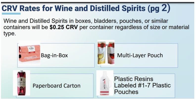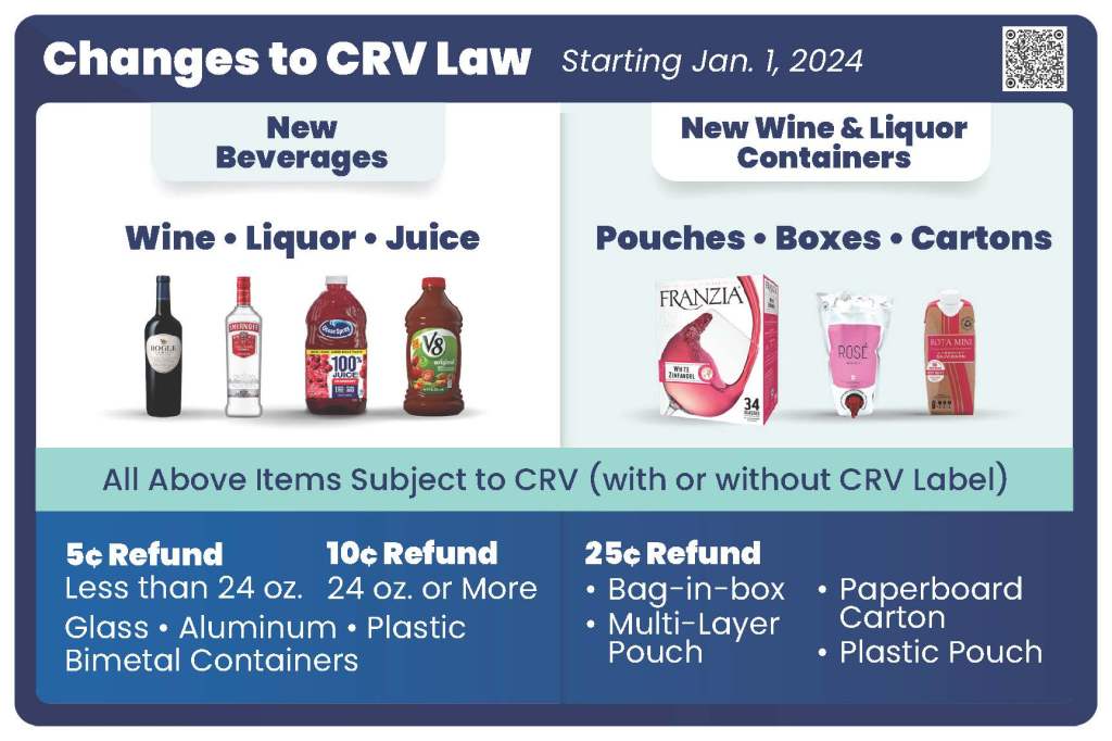 Beginning January 1, 2024, CalRecycle has added in some more items to the CRV program. The program now includes Alcohol and 100% Juice. This also includes Boxed Wines, Pouches and Paper Board alcohol. I have included a picture of some of the items and the refund amount.